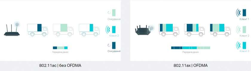 Чем больше устройств подключено к роутеру и чем активнее они используют соединение – тем ниже скорость и стабильность подключения. В Wi‑Fi 6 эта ситуация сильно улучшилась. Роутеры с поддержку более старых стандартов Wi-Fi могут одновременно обмениваться данным максимум с несколькими устройствами. Благодаря технологии OFDMA, которая появилась в Wi‑Fi 6, появилась возможность вести параллельный обмен данными с большим количеством устройств. Идет передача более коротких пакетов, но большему количеству устройств. Графика с сайта TP-Link: