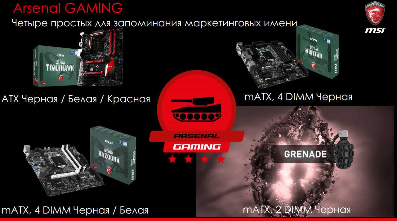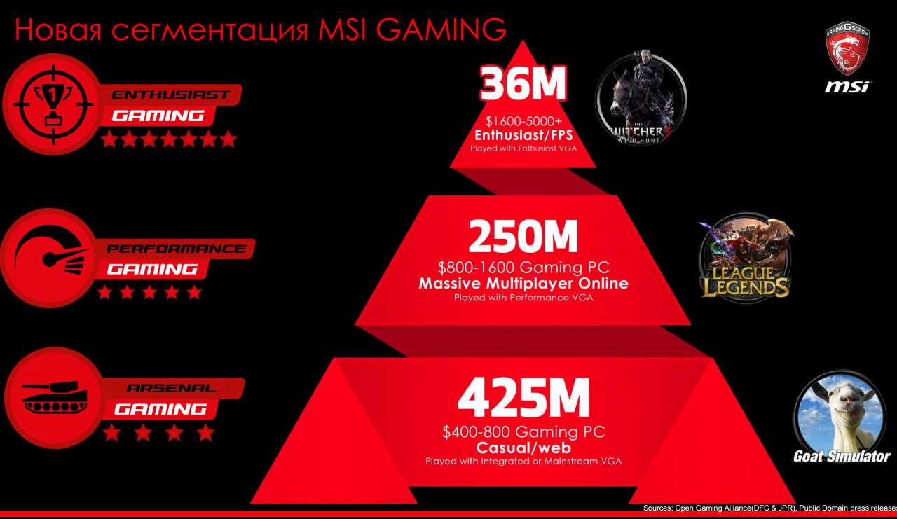По словам Михаила Сухова, директора по маркетингу и продажам MSI, с выходом новой платформы, компания приняла решение сегментировать устройства игровой серии, выделив три основных класса. Продукты Enthusiast Gaming предназначены для самых требовательных энтузиастов, пользователей с обостренным чувством прекрасного, которые готовы серьезно потратиться на покупку платформы. Платы класса Performance Gaming ориентированы на владельцев, которым важен индивидуальный стиль, а оснащение и производительность также играют пусть не основную, но немаловажную роль. Устройства Arsenal Gaming могут заинтересовать любителей поиграть, которым нужна стабильная платформа для своих «задач», но серьезно тратиться на расширенную функциональность они не планируют.