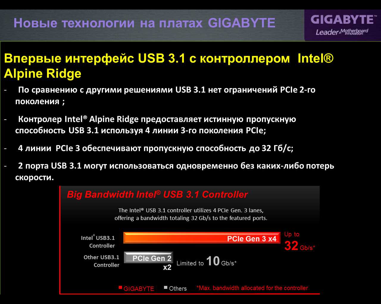 Платы GYGABYTE начинают поддерживать USB 3.1, причем для реализации интерфейса используется контроллер Intel Alpine Ridge.