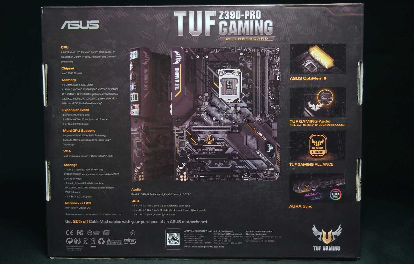 Много информации на тыльной стороне упаковки относится к техническим возможностям материнской платы. В случае с TUF Z390-Pro Gaming здесь есть на что посмотреть, ведь эта модель является старшей в линейке TUF Gaming.