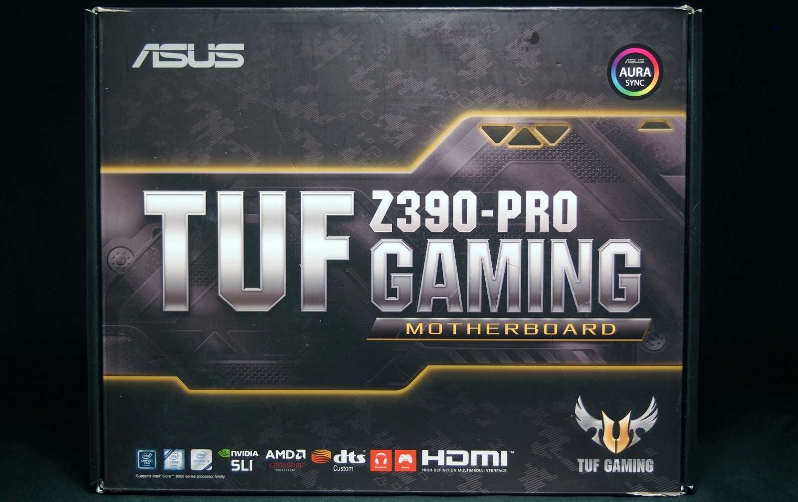 Коробка TUF Z390-Pro Gaming оформлена в традиционные для серии TUF цвета. Иллюстрация подсказывает, какие формы печатной платы стоит ожидатьв данной модели.
