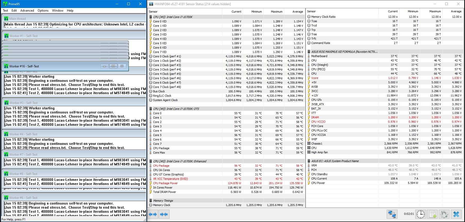 Для нагрузки системы питания процессора используем стресс-тест Prime95. В этой ситуации процессор потребляет уже 201 Вт и нагревается до 71 градуса Цельсия. Но поскольку технология MCE в настройках BIOS платы Maximus XII Formula находится в положении Auto, то после минуты нагрузки следует понижение рабочих частот CPU, чтобы последний мог вписаться в TDP 125 Вт.