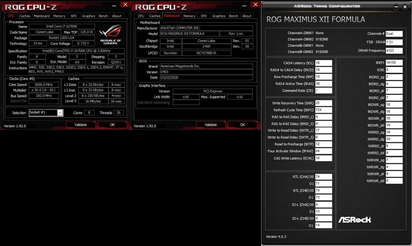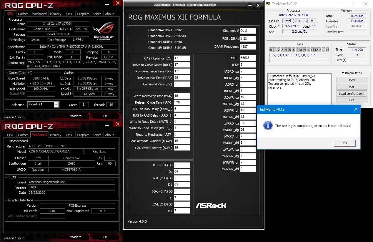 Материнская плата Maximus XII Formula тестировалась вместе с процессором Intel Core i7-10700k и оперативной памятью TeamGroup T-Force Xtreem DDR4-4133 2 х 8 Гб. На момент тестирования платы использовался BIOS версии 0607.
