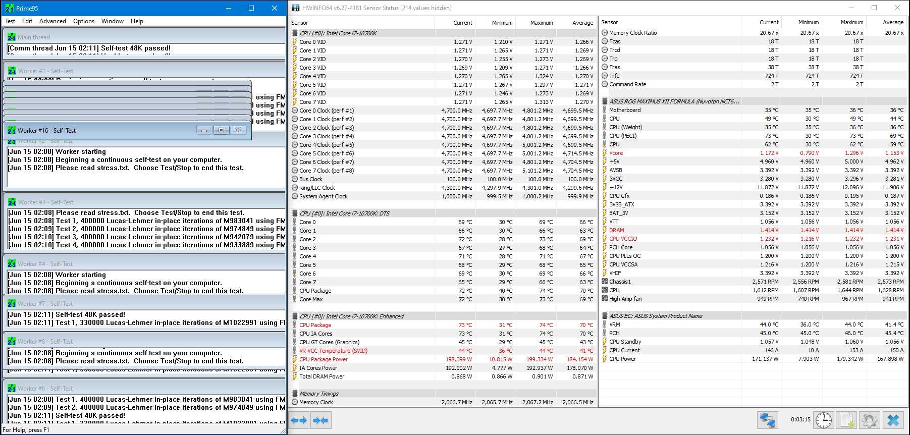 Для полной проверки Maximus XII Formula нагружаем процессор стресс-тестом Prime95 снова. Теперь, когда технология MCE активирована, а лимиты отключены, материнская плата позволяет функционировать CPU на частотах 4.7 ГГц при AVX2 нагрузке. Энергопотребление в этом случае составляет 200 Вт, а температура самого горячего ядра Core i7-10700k — 74 градуса Цельсия.