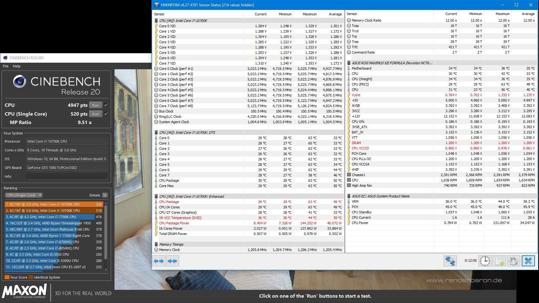 Маловероятно, что кто-то будет приобретать Maximus XII Formula для эксплуатации системы на заводских настройках. Но все же мы проверим, как работает эта материнская плата с дефолтными настройками. Оказалось, что Maximus XII Formula очень деликатно работает с питанием процессора Core i7-10700k, позволяя тому потреблять не более 145 Вт при рендеринге. Отсюда и низкий нагрев CPU до 63 градусов Цельсия.