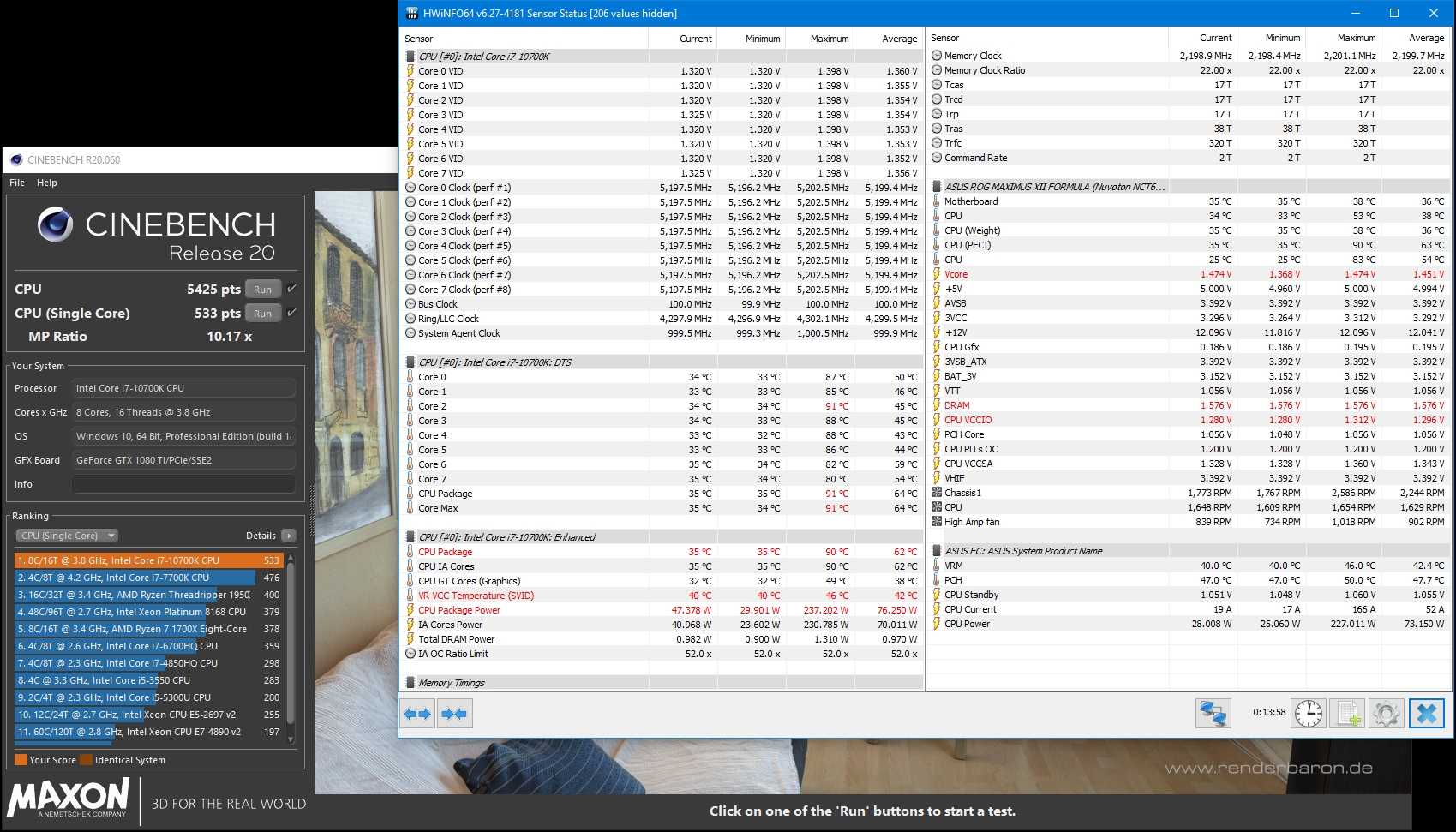 Материнская плата Maximus XII Formula очень уверенно разгоняет процессор, позволяя нашему экземпляру Core i7-10700k функционировать стабильно на частоте 5.2 ГГц. Для этого в настройках BIOS напряжение Vcore было установлено на 1.48 В, а значение LLC = 5.