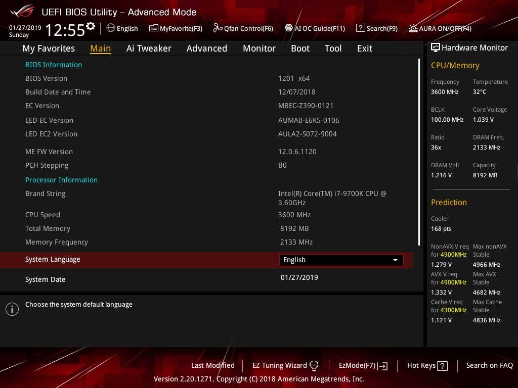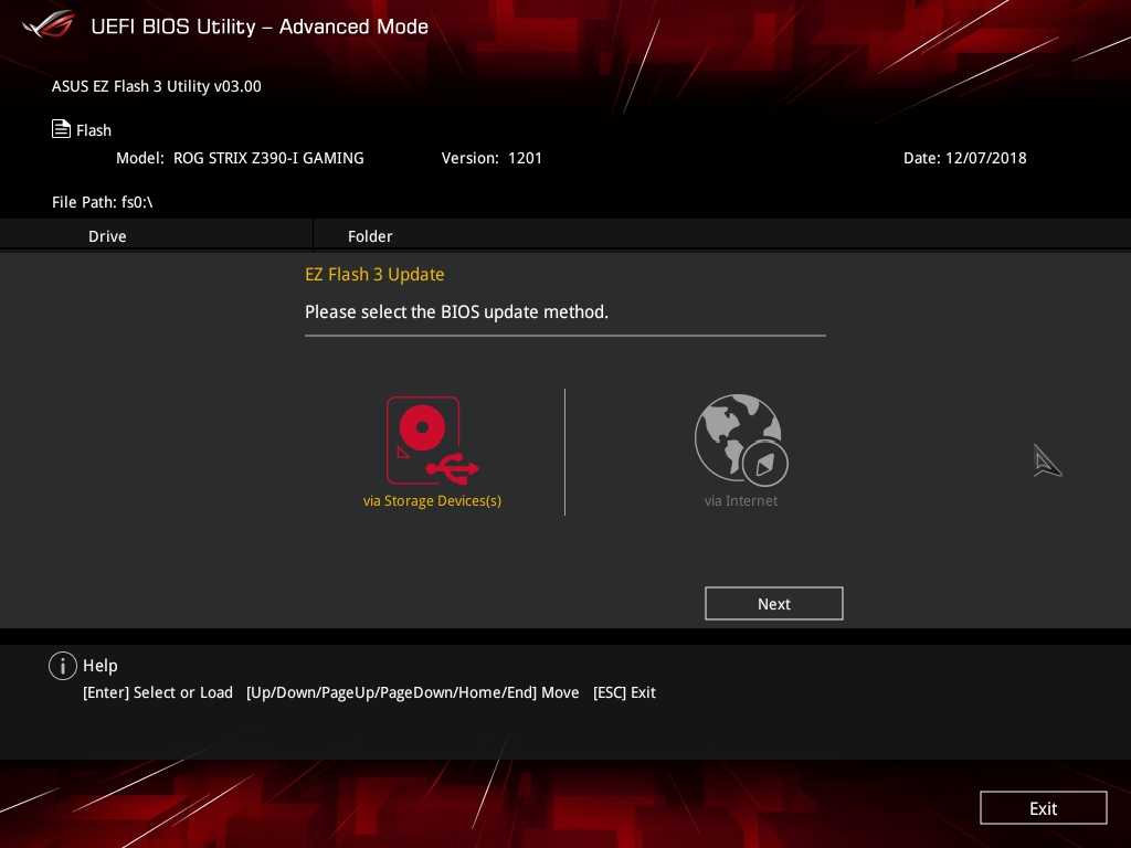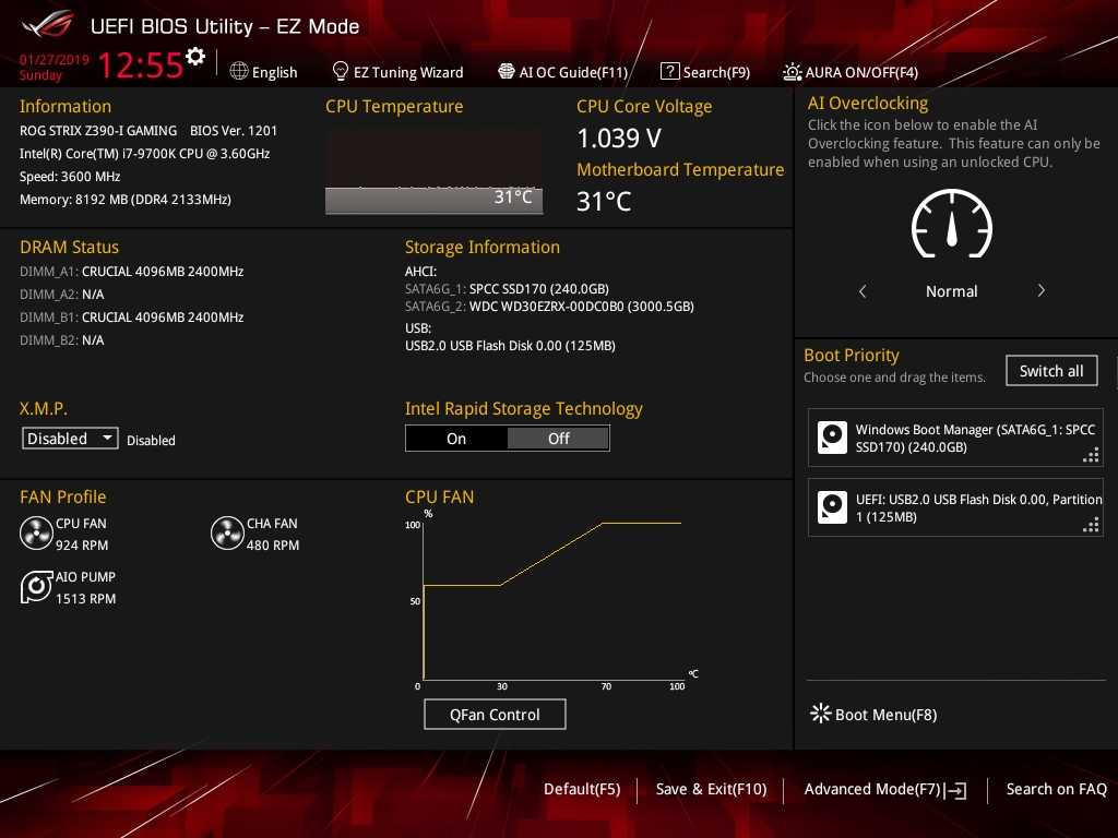 Оболочка BIOS платы ROG Strix Z390-I Gaming оформлена в меру красочно и гармонично. Настройки разделены тематически, а их форма представления реализована в два вида интерфейса EZ Mode и Advanced Mode. На скриншоте ниже представлен EZ Mode, на котором отображается основная информация о системе.