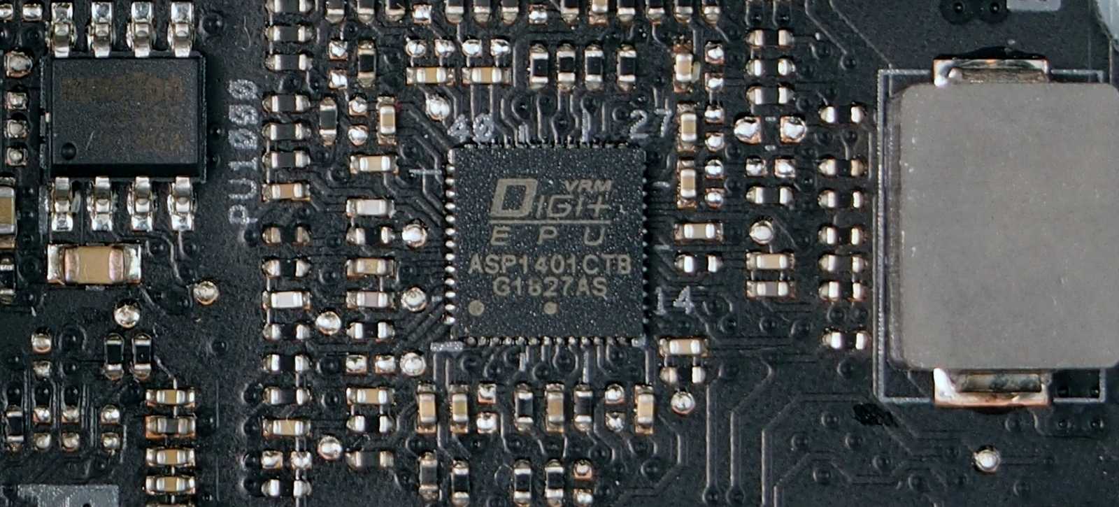 Управление питанием процессора на материнской плате ROG Strix Z390-I Gaming возложено на ШИМ-контроллер ASP1401СTB. Для подачи питания на плату используются 24-пин и 8-пин силовые разъемы.