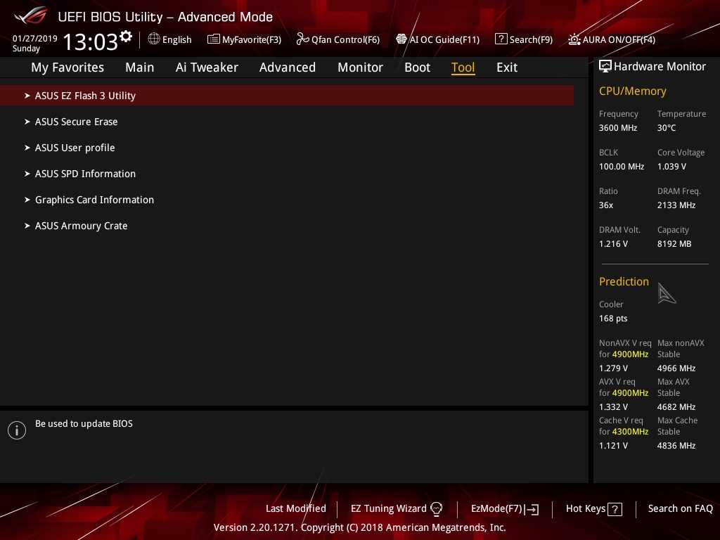 Сервисные функции BIOS материнской платы сосредоточены во вкладке «Tool». Здесь можно посмотреть установленные в сборку компоненты, обновить BIOS и работать с пользовательскими профилями настроек.