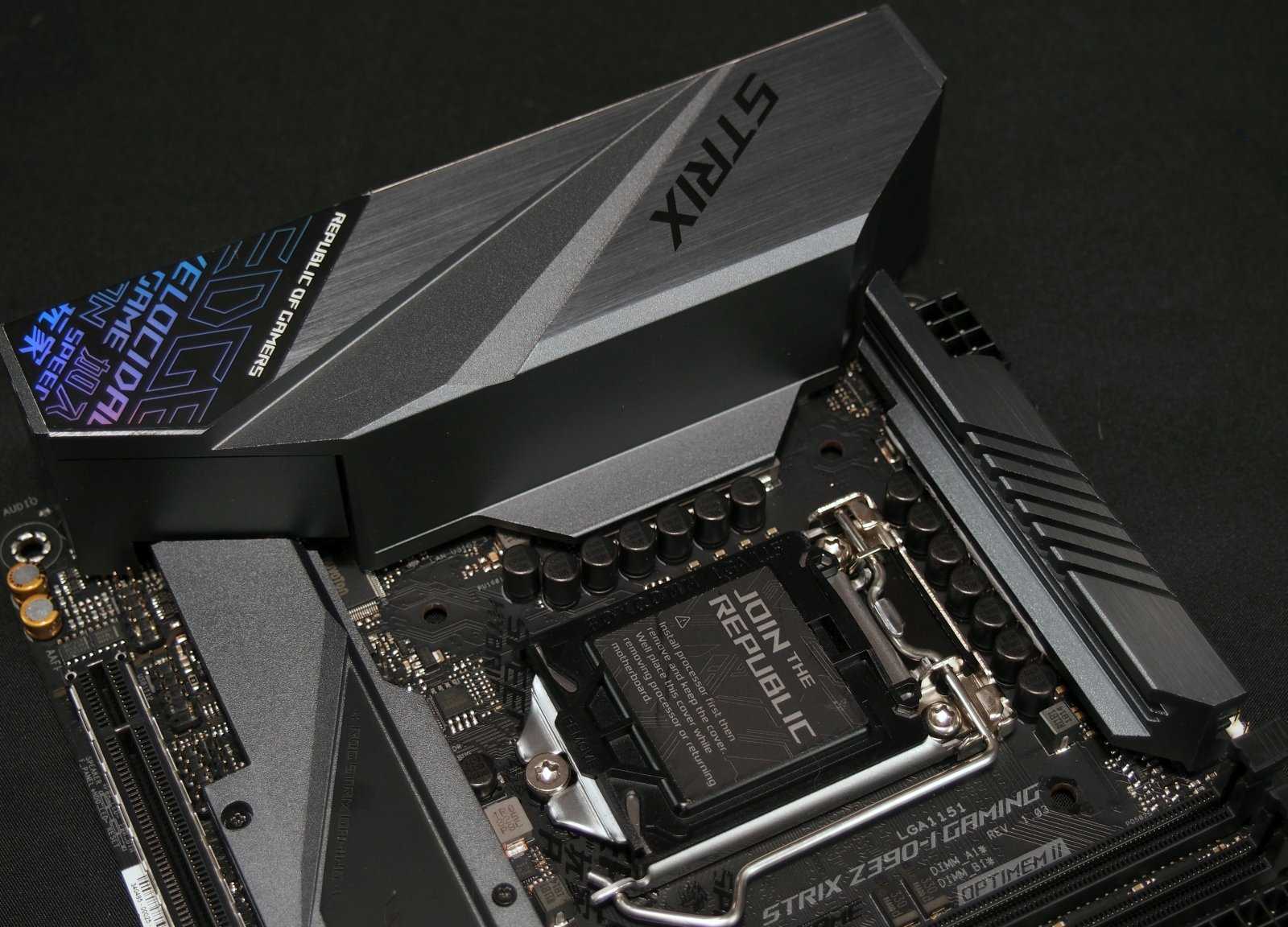 С первого взгляда может показаться, что околосокетное пространство на ROG Strix Z390-I Gaming слишком плотно окружено радиаторами охлаждения, но так кажется лишь на фоне малых габаритов платы. Ради эксперимента мы попробовали поставить на ROG Strix Z390-I Gaming сверх габаритный кулер Deepcool ASSASSIN II, и он был установлен без проблем.