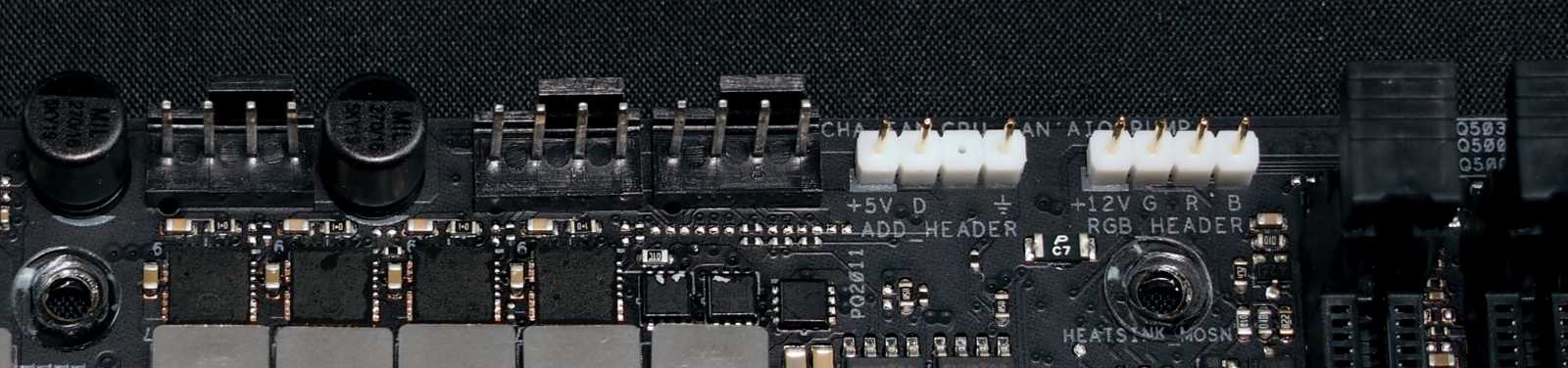 Плата ROG Strix Z390-I Gaming располагает тремя разъемами 4-пин PWM для подключения систем охлаждения. Все они находятся на верхней грани материнской платы. Здесь же соседствует и пара разъемов для подключения лент подсветки с +5 и +12 В питанием.