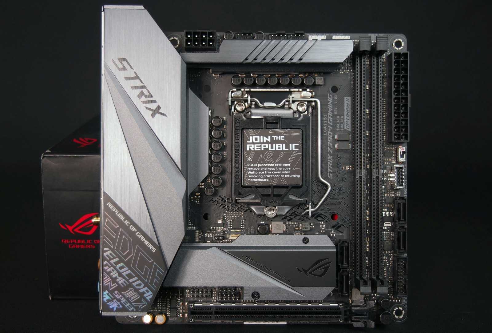 Интересной особенностью ROG Strix Z390-I Gaming является, конечно же, сверхмалый размер материнской платы при присутствующих в ней возможностях. Данная модель может принять на борт топовые процессоры Intel Core i7-9700k и Core i9-9900k, а также скоростную память DDR4. При этом не стеснена ROG Strix Z390-I Gaming и возможностями разгона этих компонентов. Вследствие форм-фактора Mini-ITX компоновка элементов на плате выполнена очень плотно.
