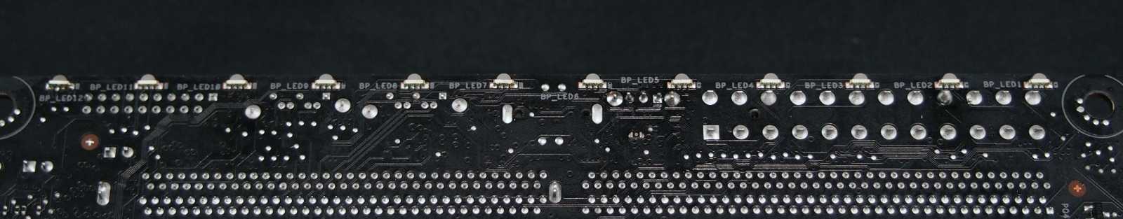 Не обделена материнская плата ROG Strix Z390-I Gaming и светодиодной подсветкой. Ряд из 12-ти RGB диодов распаян на тыльной стороне в правой части материнской платы.