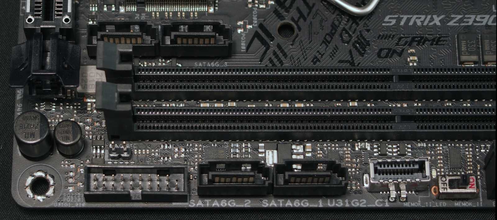 Для подключения накопителей с разъемом SATA материнская плата располагает 4-мя соответствующими разъемами. Все они находятся в правом нижнем углу. Здесь же пользователь обнаружит коннекторы USB 3.1 Gen 1 и USB 3.1 Gen 2 Type-C для подключения разъемов фронтальной панели корпуса.