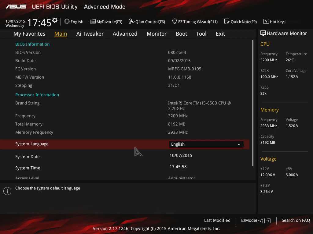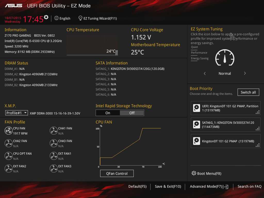 При нажатии клавиши F7 интерфейс переходит в режим Advanced Mode, который для меня, и, наверное, многих других, является более привычным. Вообще, сам интерфейс UEFI BIOS у ASUS Z170 PRO GAMING по оформлению очень сильно напоминает таковой у плат линейки ASUS ROG: та же черно-красная цветовая гамма и шрифт серого цвета.