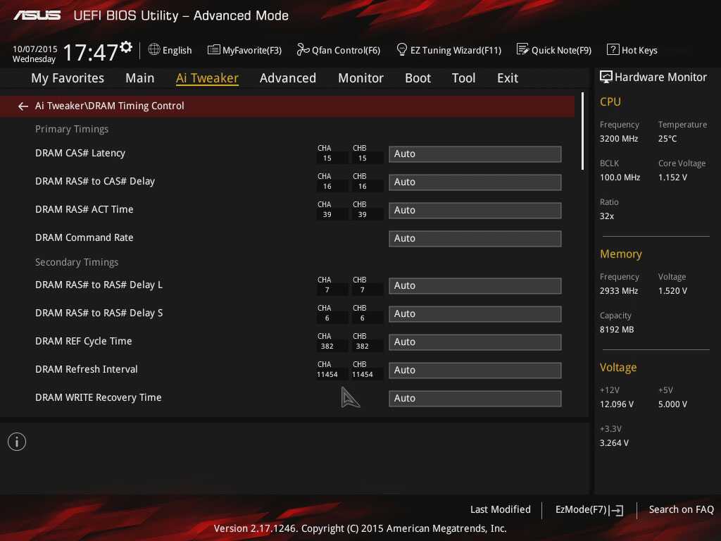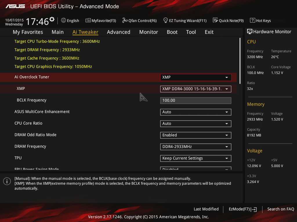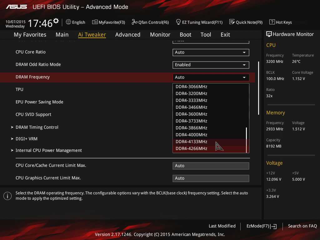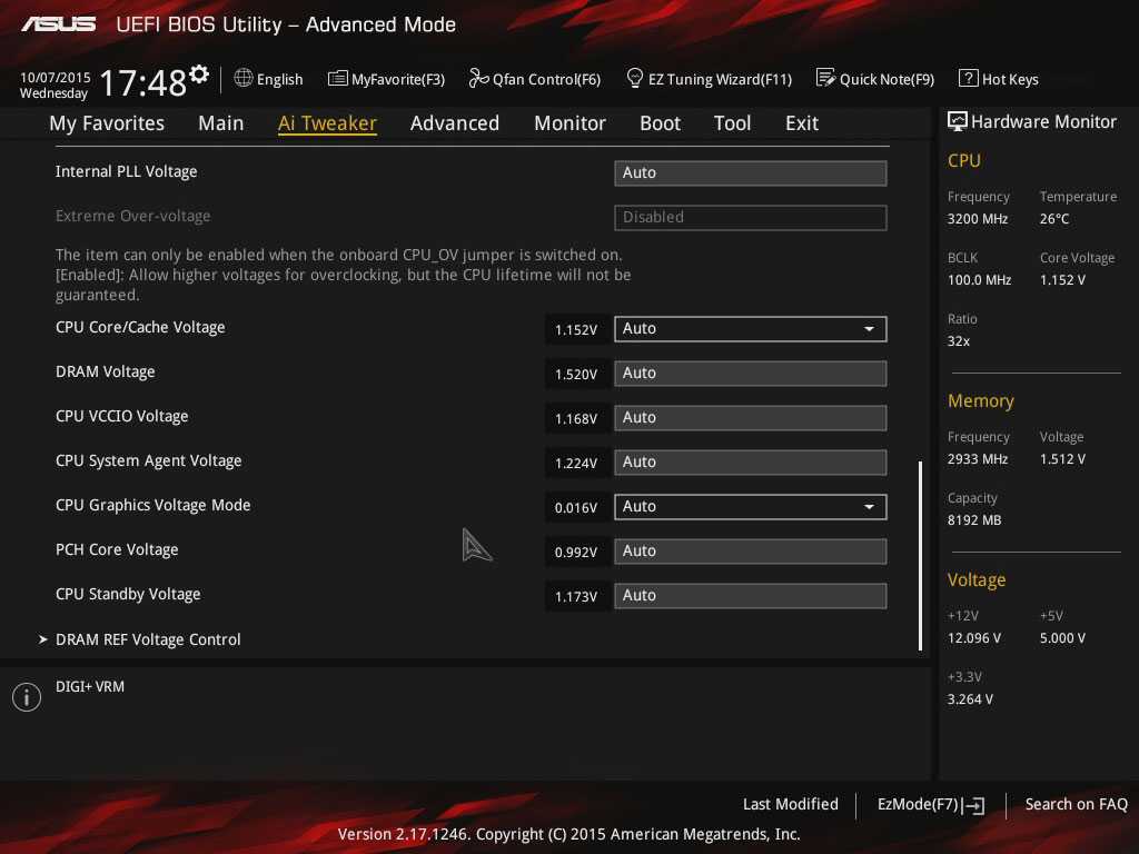Вкладка AI Tweaker – самая любимая часть меню оверклокеров. На удивление, ASUS Z170 PRO GAMING обладает полным набором настроек, которые могут потребоваться даже при экстремальном разгоне, плата обладает достаточно большим диапазоном множителей памяти DDR4, вплоть до 4266 МГц. Благодаря переключателю CPU_OV действительно можно расширить диапазон напряжений на центральный процессор, а вкладка Extreme Over-Voltage становится активной.