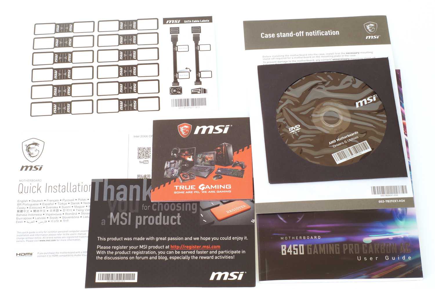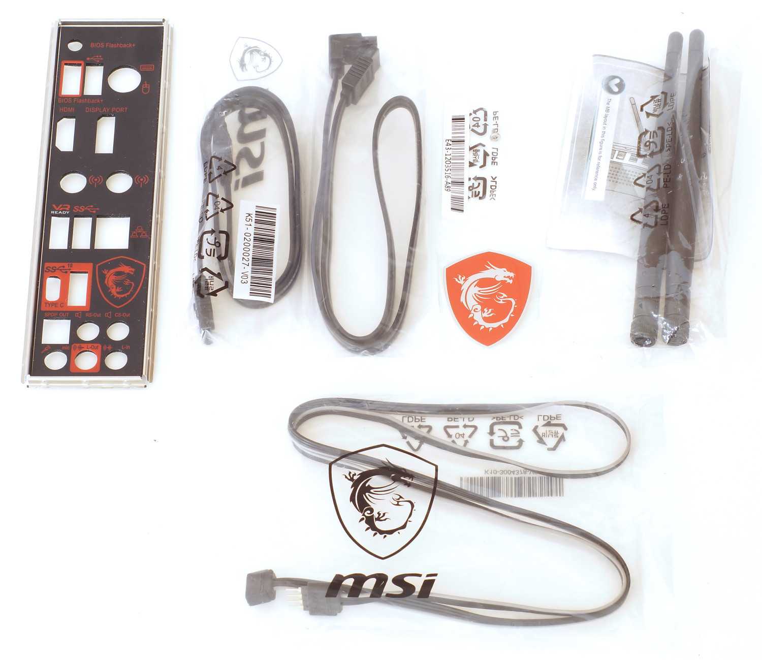Комплектация у платы солидная, но не «максимальная». Большую часть занимает бумажная составляющая: наклейки на кабели, полное и краткое руководство, информация по регистрации и продуктам MSI, DVD-диск. Из прочих аксессуаров внутри можно найти заднюю панель ввода-вывода, 2 SATA кабеля, 2 внешних антенны, логотип MSI, кабель для подключения RGB-лент.