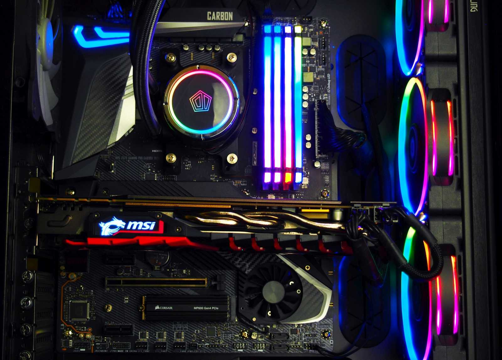 Так выглядела материнская плата X570 Gaming Pro Carbon Wi-Fi в составе тестового стенда. Видно, что RGB-подсветка присутствует на декоративной панели в верхнем левом углу и на правом торце X570 Gaming Pro Carbon Wi-Fi.