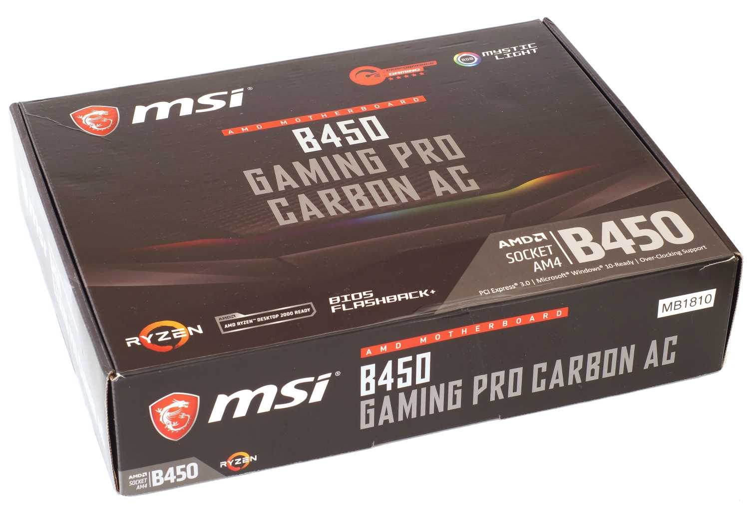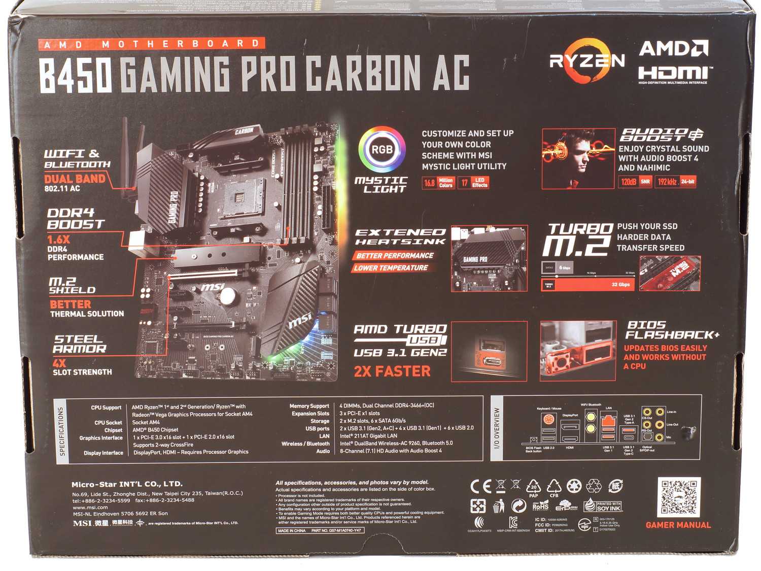 Чем выше уровень материнской платы MSI, тем более яркое и красочное оформление используется в дизайне коробки. Внешний вид упаковки материнской платы MSI B450 GAMING PRO CARBON AC можно охарактеризовать как «промежуточный» между коробками плат топ-уровня и бюджетными решениями, так как красного (игрового) цвета стало меньше, но принадлежность платы к игровой серии Performance Gaming указана, как и поддержка подсветки Mystic Light с доступными 17-ю эффектами. Основой платы является чипсет AMD B450 и производитель подчеркивает об ориентации на процессоры AMD Ryzen 2000-й серии, хотя никто не мешает использовать и первое поколение Ryzen.