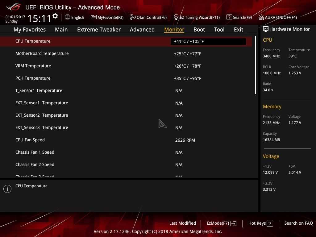 Пункт Monitor отведен под показания всех датчиков используемых в сборке — температуры, напряжения, оборотов вентиляторов.