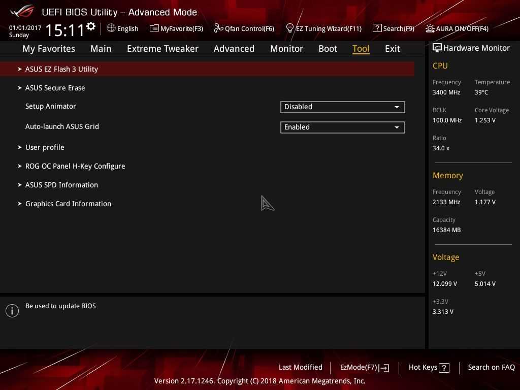 Вкладка Tool позволяет обновить версию BIOS и настроить профили режимов ОС для быстрого запуска.