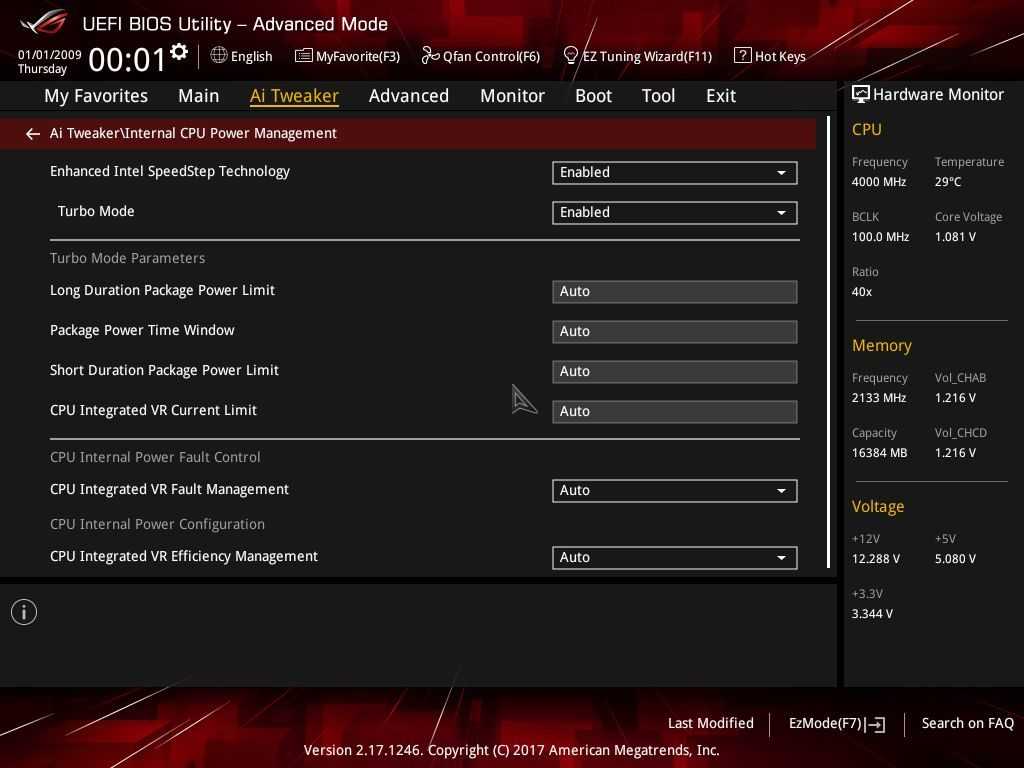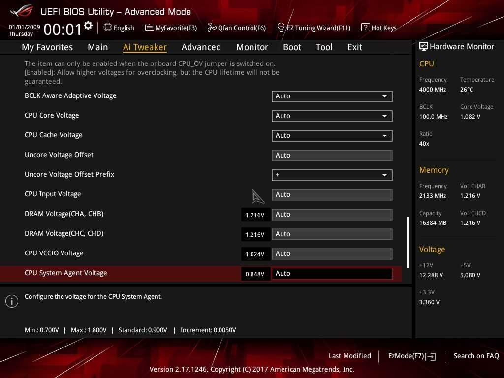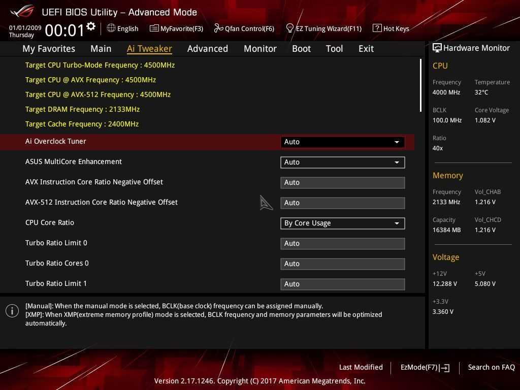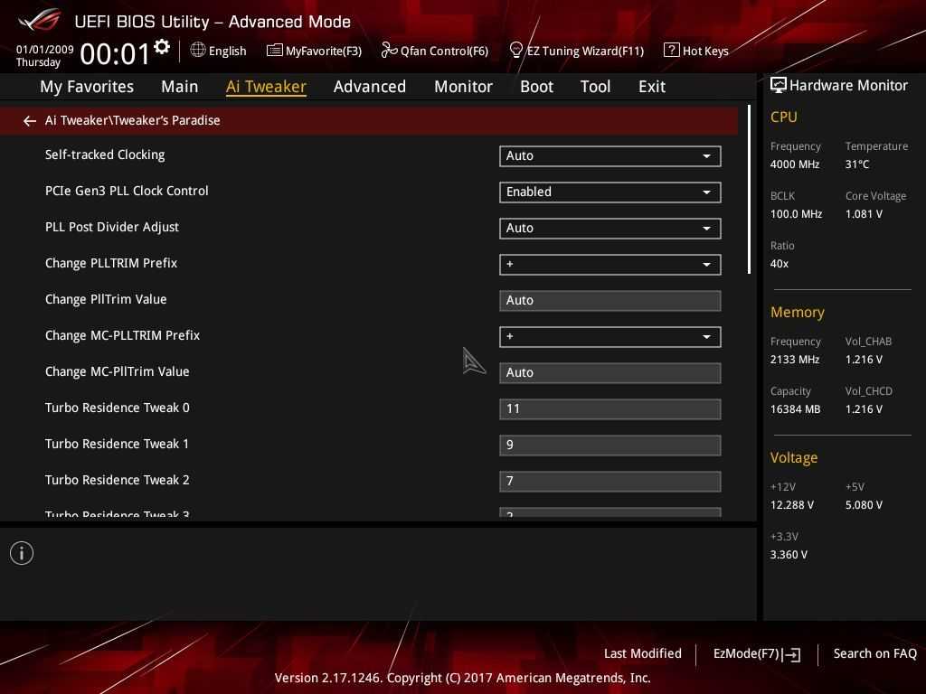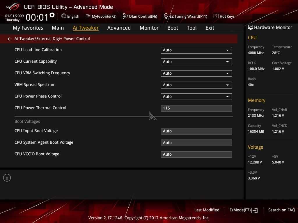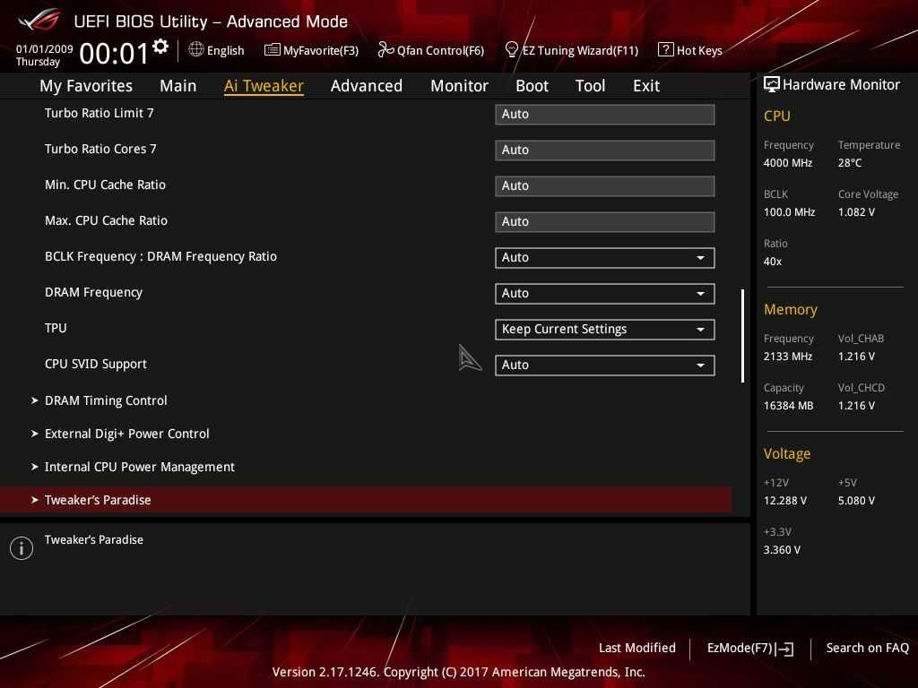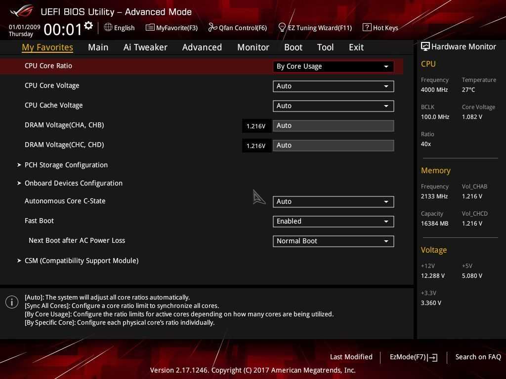 Вкладка Ai Tweaker содержит основные параметры для разгона процессора и оперативной памяти. Здесь вы сможете найти такие параметры как: множитель CPU, частота BCLK, частота памяти, настройки системы питания, настройки таймингов и возможность повышения напряжений. Кроме того имеется отдельное подменю DIGI+ VRM, позволяющее тонко настраивать систему питания процессора и оперативной памяти. Воспользоваться функцией ручной настройки множителей и напряжений для всех ядер можно в меню By Specific Core.