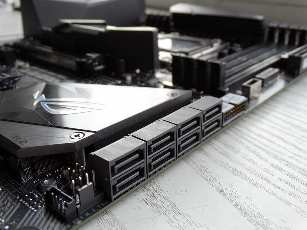 Для подключения накопителей на материнской плате реализовано 8 разъемов SATA 6 Гбит/с и 2 порта для установки высокоскоростных SSD-накопителей форм-фактора M.2. Первый — находится в верхней части материнской платы около слотов для оперативной памяти и поддерживает подключение накопителей M.2 типов 2242/2260/2280/22110, а второй — прячется в нижней части платы под радиатором чипсета и позволяет устанавливать платы расширения M.2 типов 2242/2260/2280. Также отметим совместимость с технологией памяти Intel Optane.