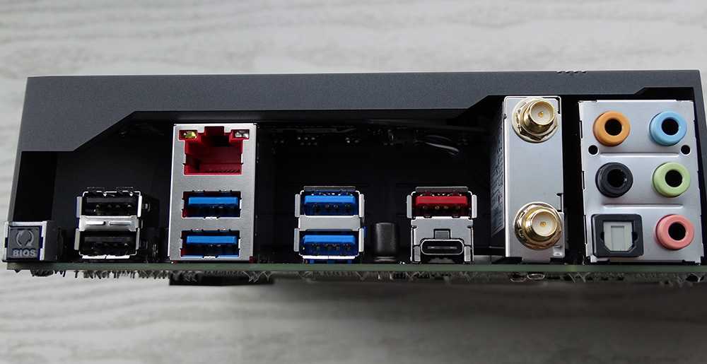 Также здесь есть два порта USB 2.0, один из которых можно задействовать для функции USB BIOS Flashback (позволяет обновлять BIOS с флеш-накопителя, не заходя в настройки самого BIOS и не загружая Windows). Кроме того, чипсет Intel X299 позволяет реализовать на плате поддержку еще 4 портов USB 2.0 и 4 портов USB 3.1 Gen 1, которые доступны при подключении USB-разъемов на выносной планке.