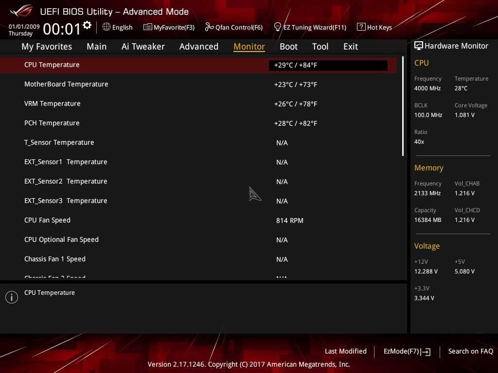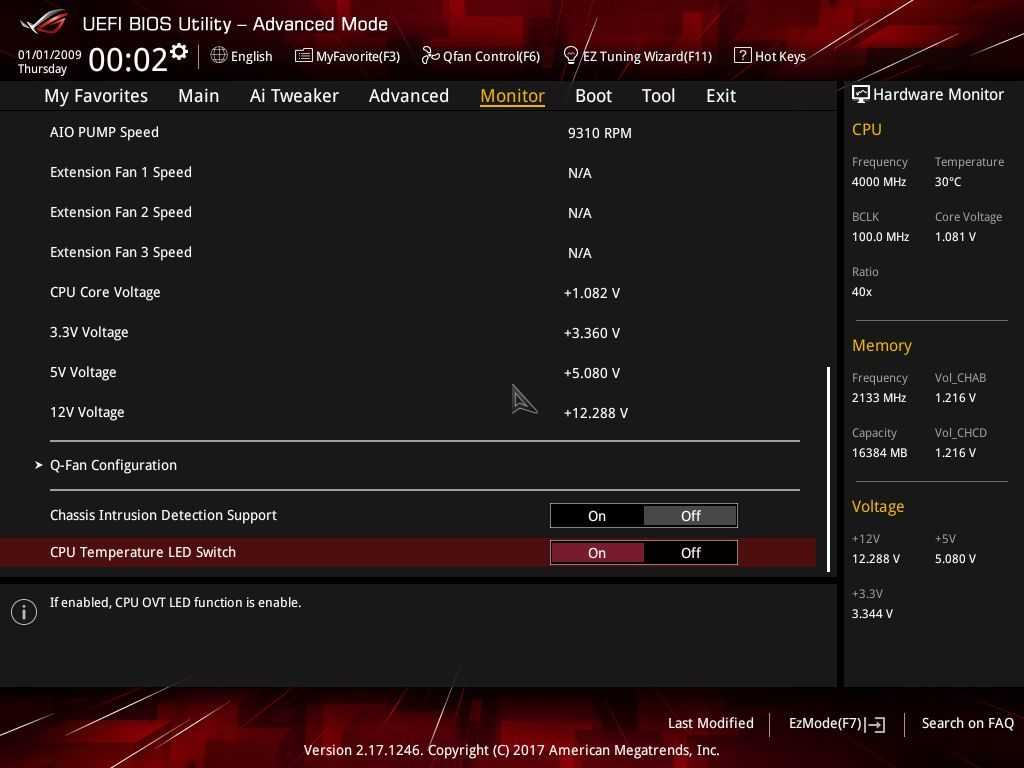 Вкладка Monitor информирует нас о температуре компонентов компьютера, основных рабочих напряжения и позволяет вручную настраивать работу вентиляторов.
