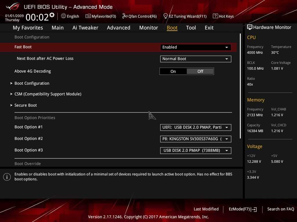 Вкладка Boot позволяет настроить очередность загрузки устройств.