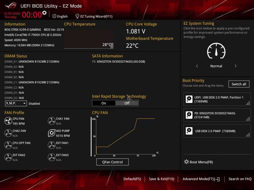 При необходимости на главной странице можно настроить режим работы вентилятора CPU или зафиксировать его обороты, выставить очередность загрузки запоминающих устройств и активировать профиль X.M.P.