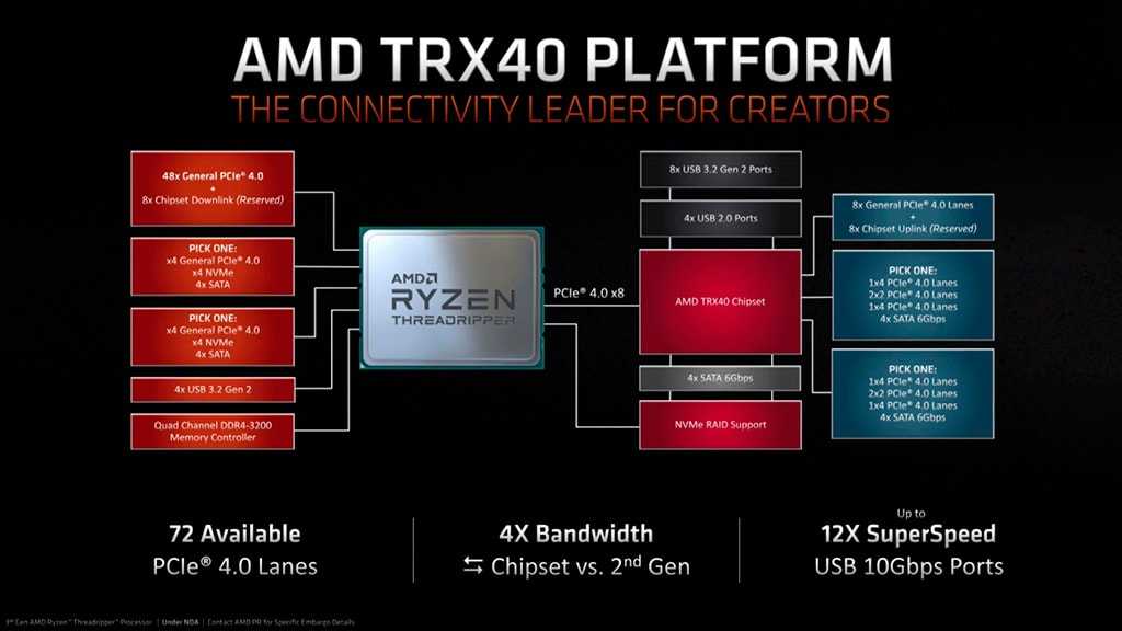 Если чуть подробнее, то TRX40 имеет свои 16 линий PCI-E 4.0, половина которых используется для подключения накопителей M.2, а половина отведена для дополнительных слотов PCI-E на материнской плате.