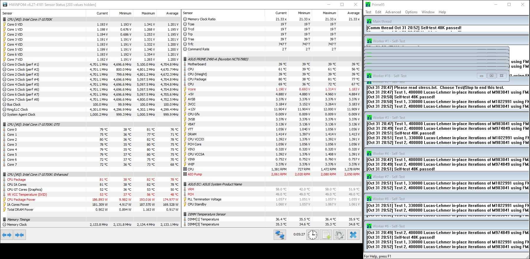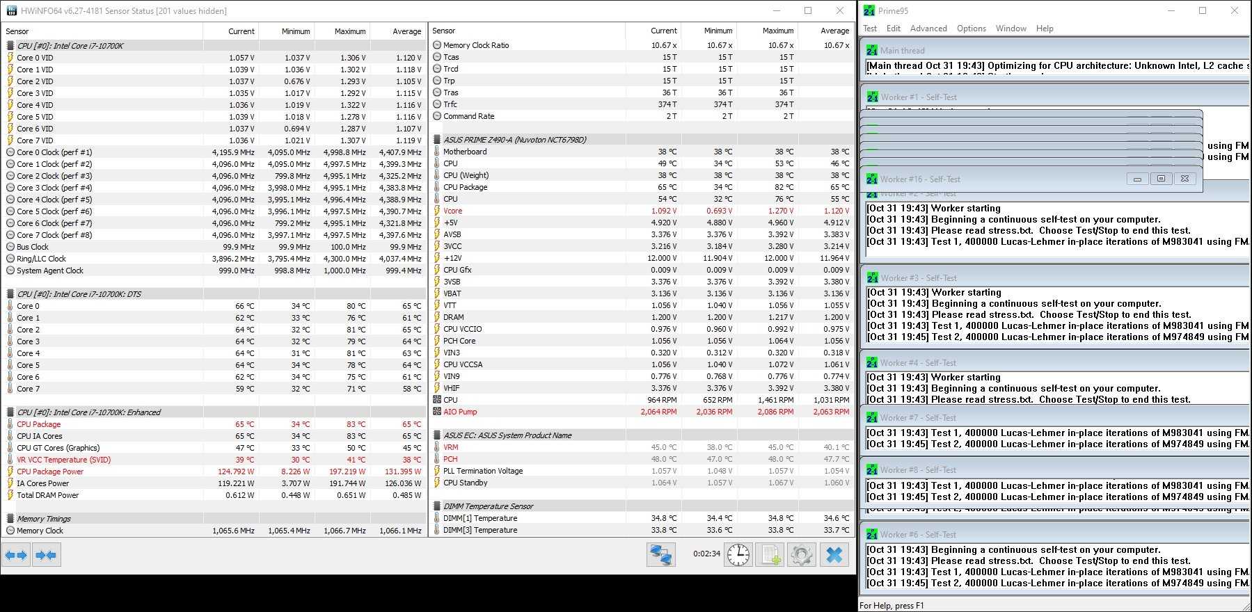 Более серьезная нагрузка системы стресс-тестом Prim95 сложно пробуждает материнскую плату, заставляя соблюдать лимит энергопотребления CPU в 125 Вт. Как следствие, под такой нагрузкой падают и рабочие частоты Core i7-10700k — в среднем до 4100 МГц.
