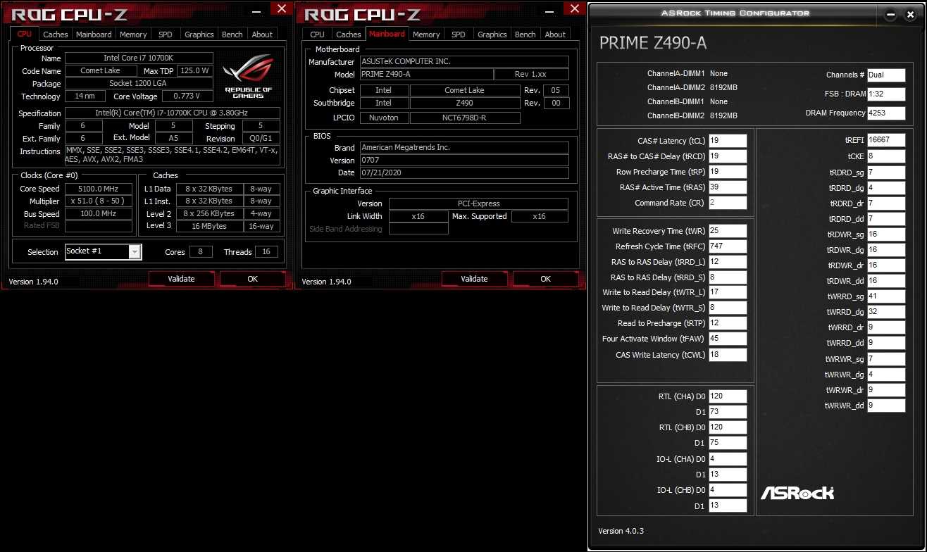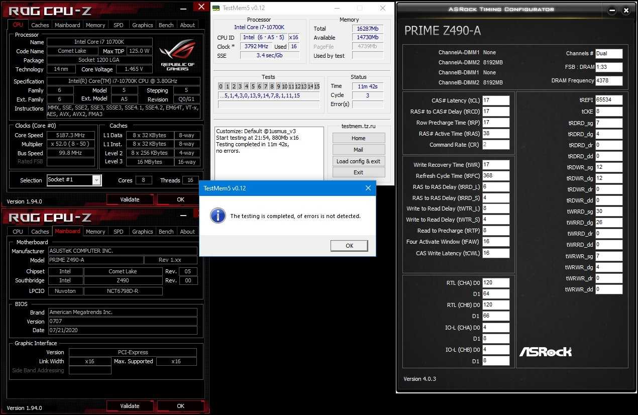 Используя оверклокерские возможности Prime Z490-A, мы разогнали процессор Core i7-10700k до 5.2 ГГц с сохранением активности всех 8-ми ядер. Модули памяти G.Skill Trident Z RGB DDR4-4266 удалось разогнать до частоты 4400 МГц, значительно снизив вторичные и третичные тайминги, а также настроив блок RTL. Для этого потребовалось установить напряжения: vCore=1.48В, vRAM=1.55В.