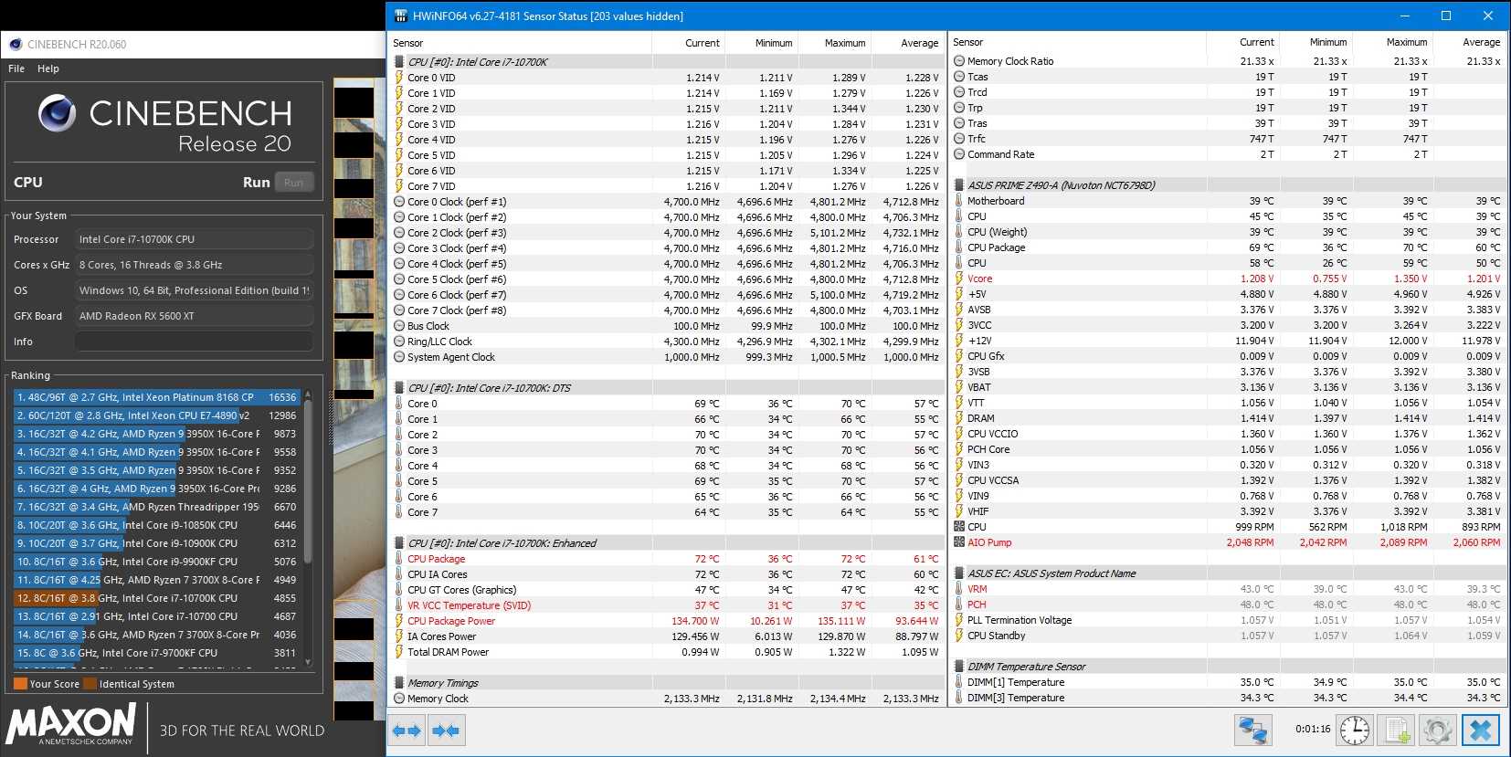 С настройками BIOS по умолчанию материнская плата Prime Z490-A работает так, будто опция MCE активирована. При рендеринге в Cinebench R20 плата выходит за лимиты энергопотребления процессора и позволяет Core i7-10700k работать на полной скорости турбо частот.