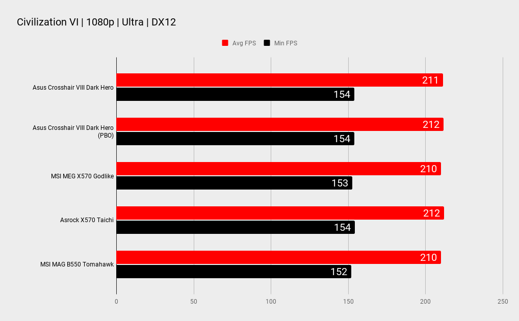 During our gaming tests, we saw appreciable gains when moving from the 3900X to the newer 5950X. Between the clock speeds, IPC and large cache differences, performance increased substantially using this CPU at our 1080p test resolution. If you game at a higher resolution, chances are you won’t see those gains unless you’re using one of the new, ultra-fast Nvidia or AMD GPUs. That out of the way, our Dark Hero proved itself to be competent in gaming as well, easily mixing in with the rest of the newly tested boards in both 3DMark and actual games.