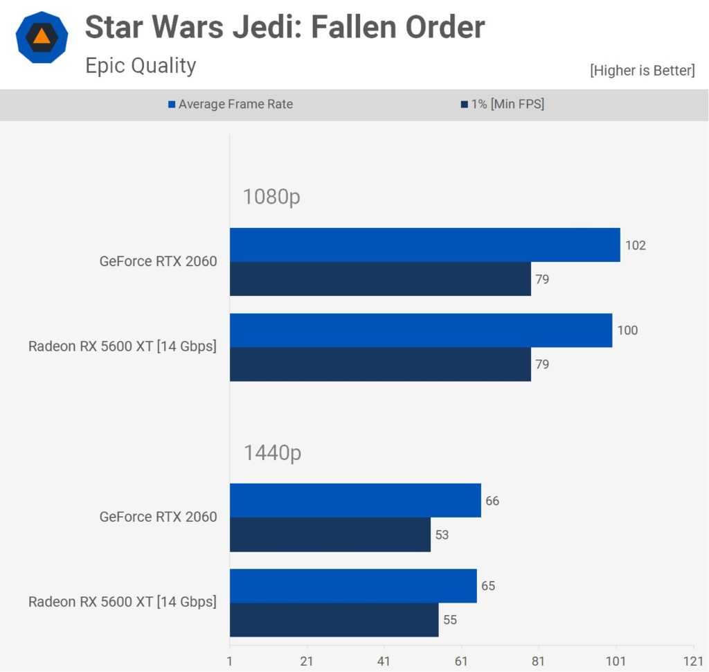 В игре Star Wars Jedi Fallen Order последние драйверы приводят к тому, что скорость работы двух видеокарт также почти идентичная.