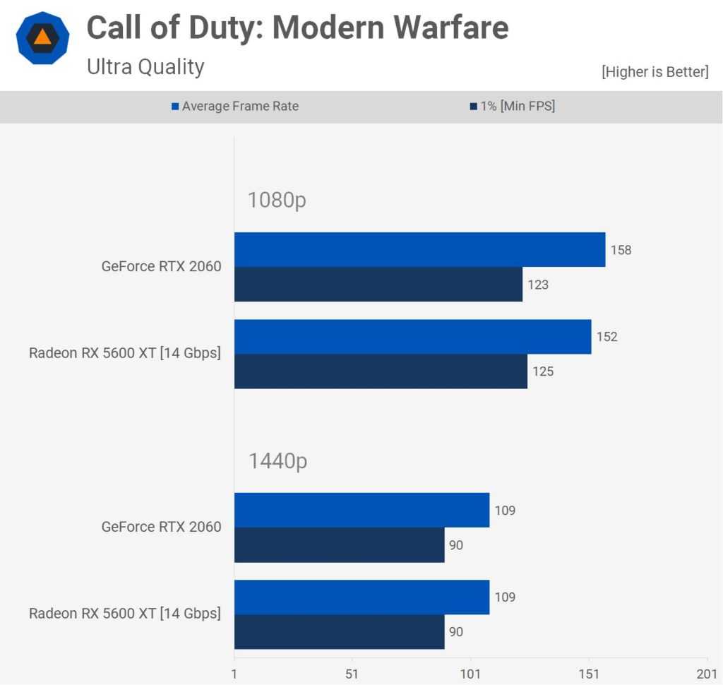 Дальше идёт игра Call of Duty: Modern Warfare и результаты снова близкие на обоих разрешениях. В первую очередь на 1080p.