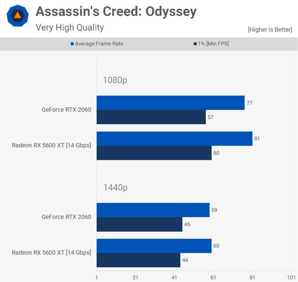 Для начала рассмотрим игру Assassin’s Creed Odyssey. Здесь 5600 XT немного опережает RTX 2060 на обоих разрешениях. На разрешении 1080p преимущество составляет 5%, на разрешении 1440p всего один кадр. Можно сказать, что производительность одинаковая.