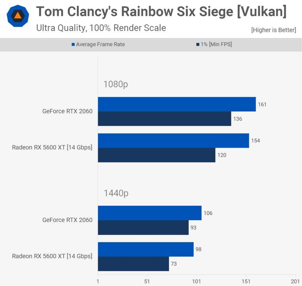 Лучше RTX 2060 справляется с игрой Tom Clancy’s Rainbow Six Siege, по крайней мере если задействовать Vulkan API. Похоже, что этот интерфейс AMD пока не оптимизировала. В нижнем 1% результат хуже по сравнению с тем, который показывается с Direct X11. Интересно будет посмотреть, как AMD улучшит работу с Vulkan в ближайшие месяцы.