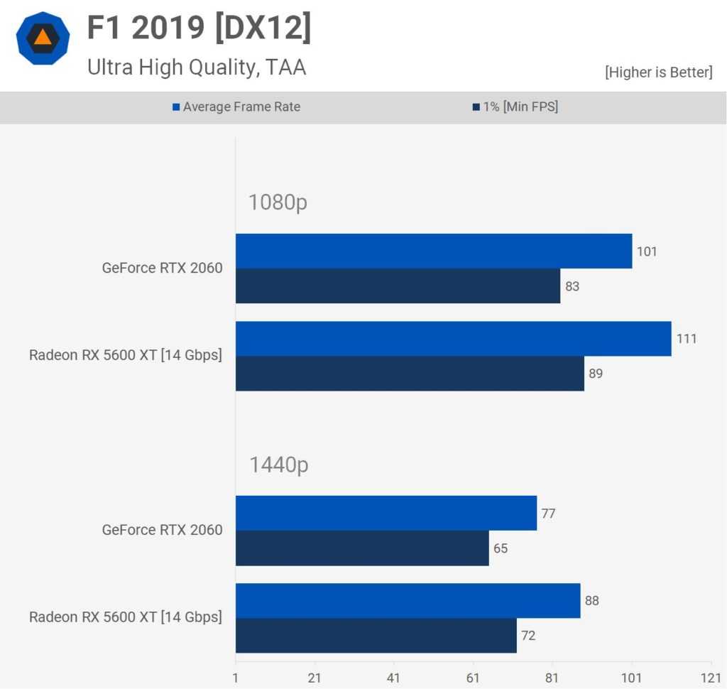 Видеокарты на графических процессорах AMD Radeon всегда хорошо проявляют себя в играх серии F1. И на этот раз 5600 XT обходит RTX 2060, опережая конкурентов на 10% при разрешении 1080p и на 14% на 1440p. Это довольно солидное преимущество.