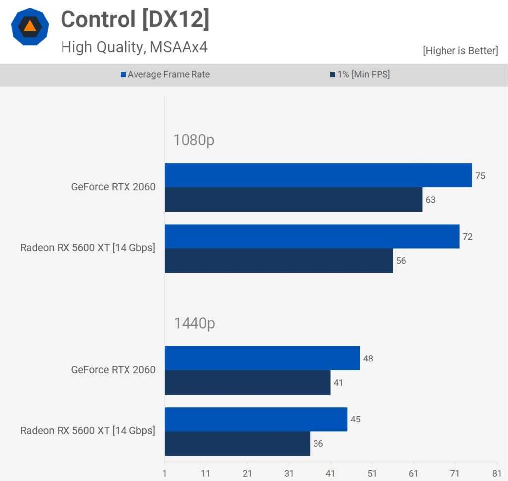 5600 XT испытывает некоторые затруднения в игре Control при использовании MSAAx4. Особенно это проявляется в нижнем 1% производительности даже на разрешении 1080p. Если смотреть на среднюю частоту кадров, RTX 2060 на 7% быстрее, но в нижнем 1% результатов преимущество GeForce составляет 14%.