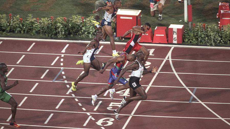 Финиш финального забега на 100 метров среди мужчин на Олимпийских играх в Атланте в 1996 году
