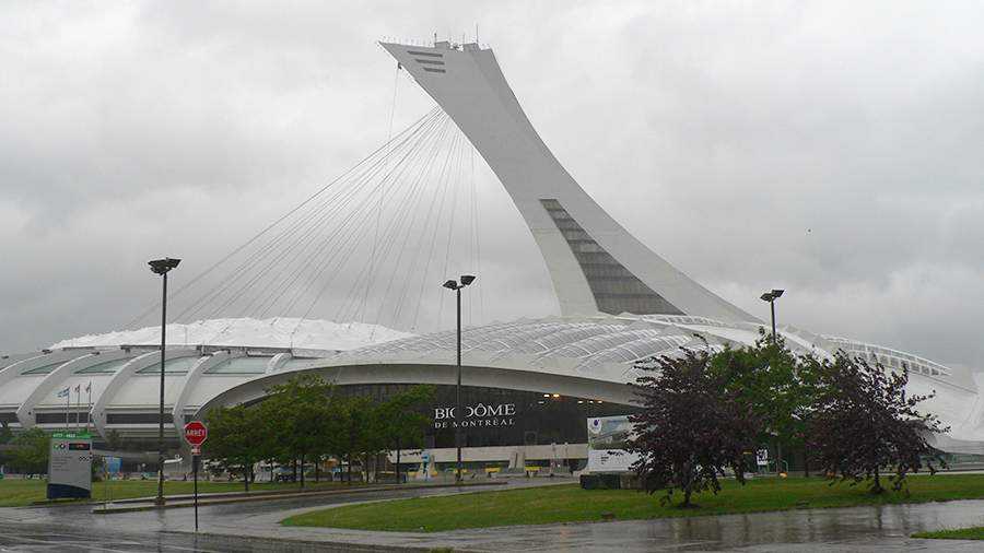 Здание бывшего велотрека (ныне Монреальский биодом) на фоне фуникулерной башни Олимпийского стадиона