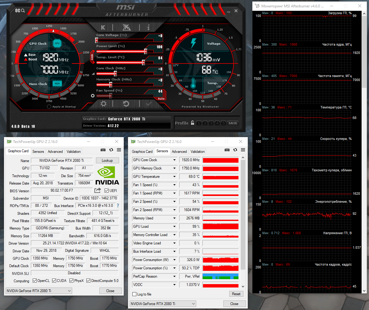 Видеокарте MSI GeForce RTX 2080 Ti Lightning Z с графическим процессором TU102 дан полный карт-бланш с увеличенным Power Limit до 350 Вт, с которым справятся не каждая топовая видеокарта, но новинка демонстрирует хорошие результаты, стабильно удерживая частоту GPU на отметке 1920-1935 МГц при температуре 68-69*С даже в тесте устойчивости 3DMark Time Spy. Вентиляторы раскручиваются до 1600 об/мин, а уровень шума является ниже среднего, комфортного для продолжительной работы. Зона VRM прогревается лишь до 77*С.