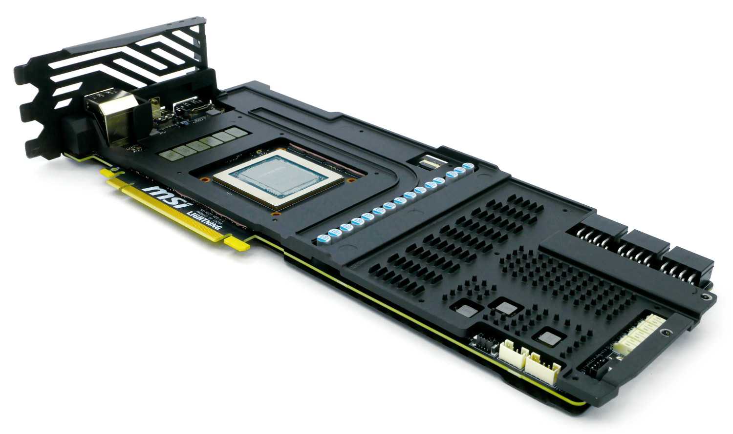 По совместительству она является и радиатором охлаждения для микросхем памяти и подсистемы питания с небольшим оребрением. В ранних прототипах применялась тепловая трубка, но на релизном образце она почему-то отсутствует.