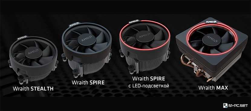Многие модели Ryzen поставляются с фирменной системой охлаждения Wraith («Призрак») с 92-мм вентиляторами. Есть пять версий штатных кулеров AMD: