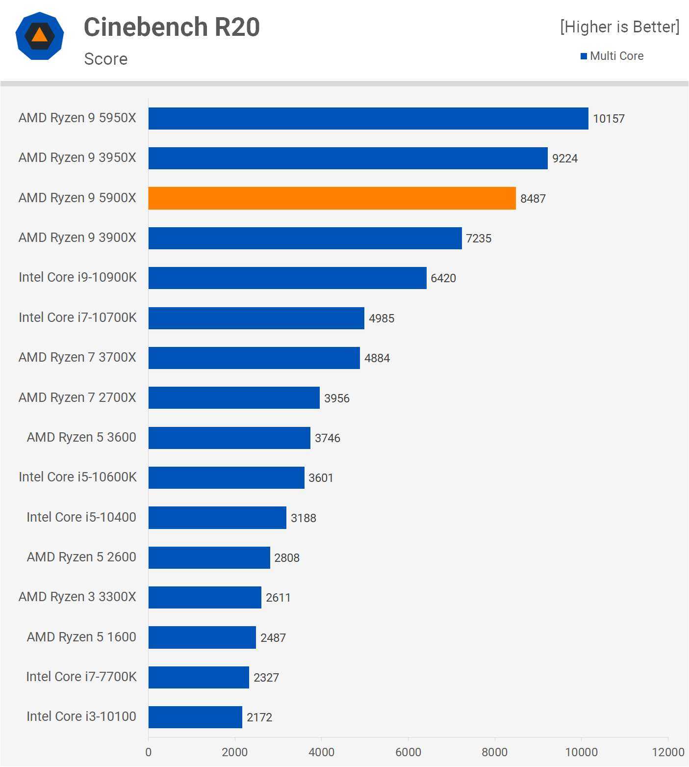 Сначала у нас есть Cinebench R20, и ничего себе, 8487 баллов — это безумно. Это на 17% больше, чем у 3900X, что делает 5900X всего на 8% медленнее, чем 3950X. Это впечатляющие цифры, учитывая, что процессор имеет на 25% меньше ядер. По сравнению с Core i9-10900K, который примерно соответствует цене, новый 5900X на 32% быстрее, хотя у него на 20% больше ядер.