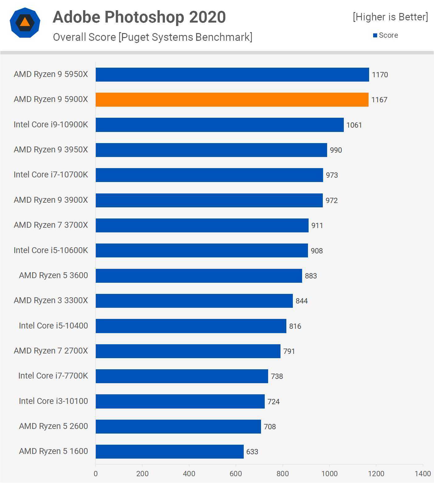 Высокая производительность одного ядра пригодится при тестировании с Photoshop, здесь 5900X соответствует 5950X, а это означает, что он был на 10% быстрее, чем 10900K, и на целых 20% быстрее, чем его предшественник, 3900X.