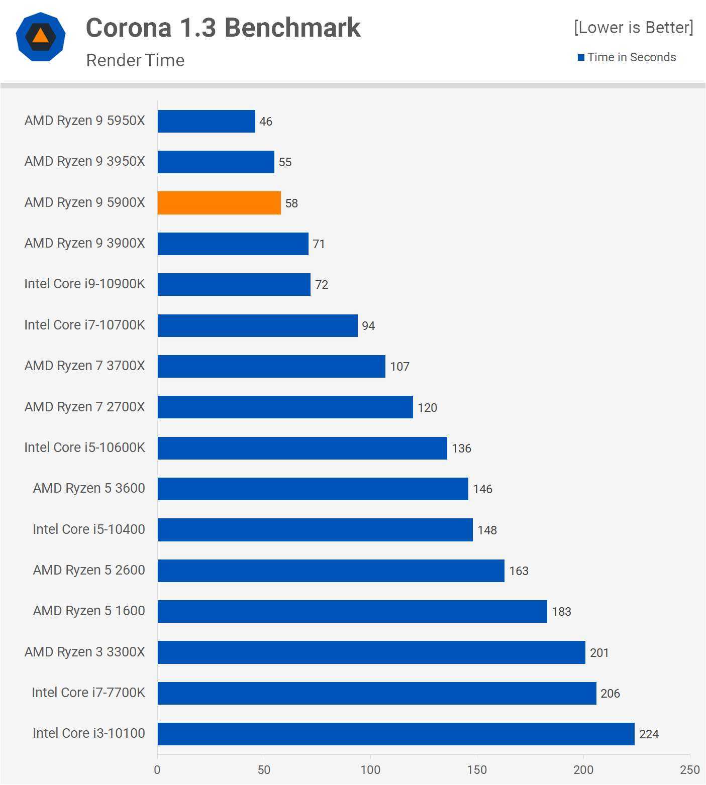 Последний тест рендеринга, который у нас есть, — это Corona, где 5900X намного быстрее, чем 3900X, увеличивая производительность на 22%, обеспечивая производительность, подобную 3950X. Это большое улучшение по сравнению с поколением, и это также означает, что 5900X был на 24% быстрее, чем 10900K.